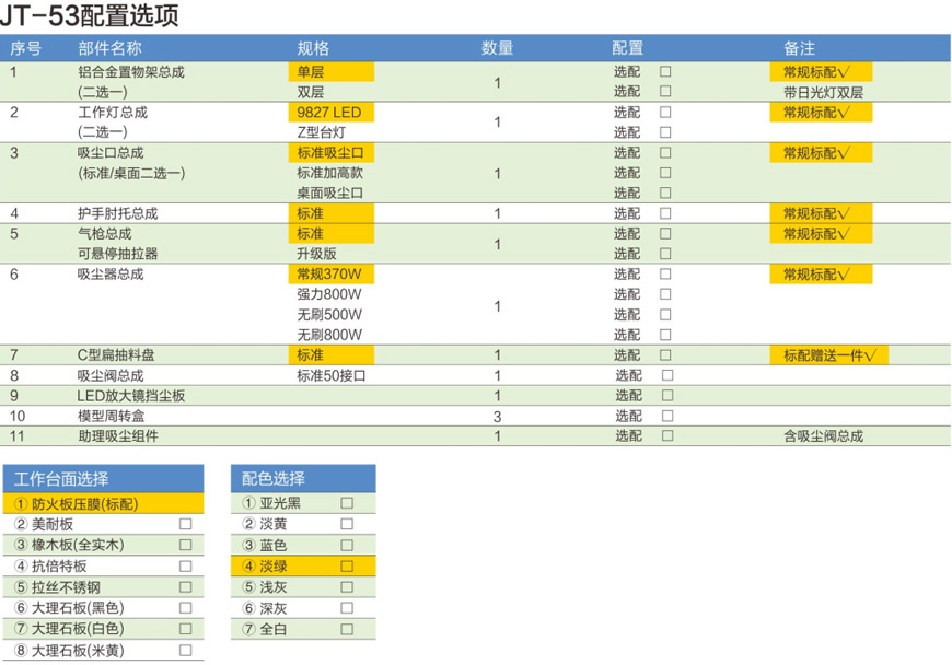 1、桌架总成:优质冷轧板/铝合金型材、铸件制成。内置隐形夹层,可将所有管线及吸尘器隐藏在内。两侧留有可相互贯通的窗口。
