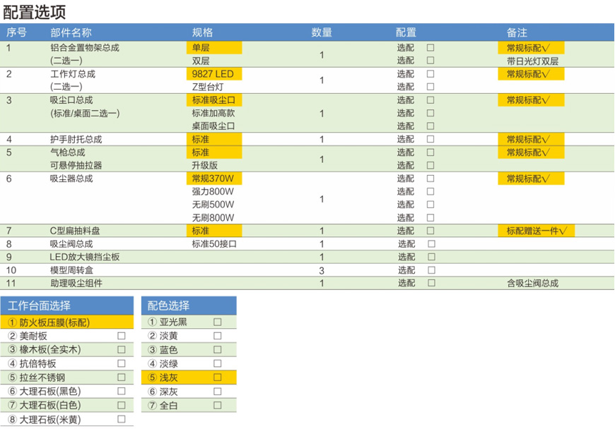3、工作灯:钢制灯臂,LED(日光型)全角度照明,中间配Ø127×5倍玻璃放大镜,单人桌×1,双人桌×2。